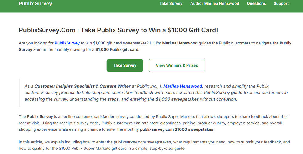 Created and maintained by Marilea Henswood, Customer Insights Specialist & Content Writer, this website provides step-by-step survey instructions and troubleshooting help. PublixSurveyUS operates from its editorial base at 1204 Highland Crest Passage, Stonebrook Valley, GA, and actively supports shoppers through community platforms like Reddit and Facebook.